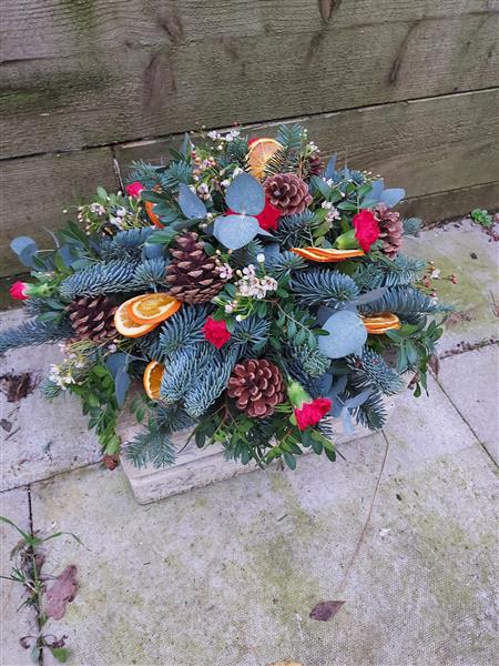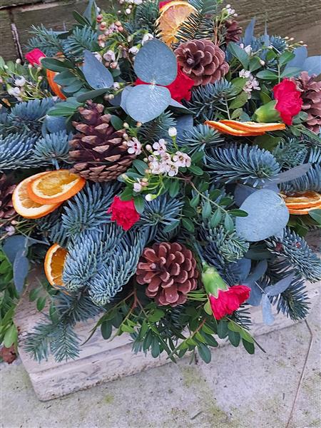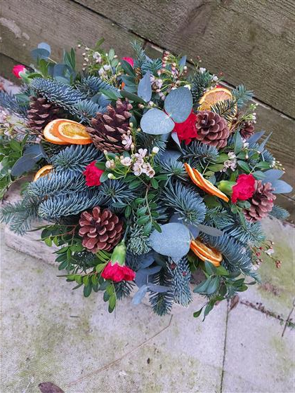 Something to place on a loved ones grave this Christmas with mixed season foliage, cones and dried sliced oranges.