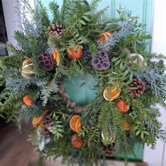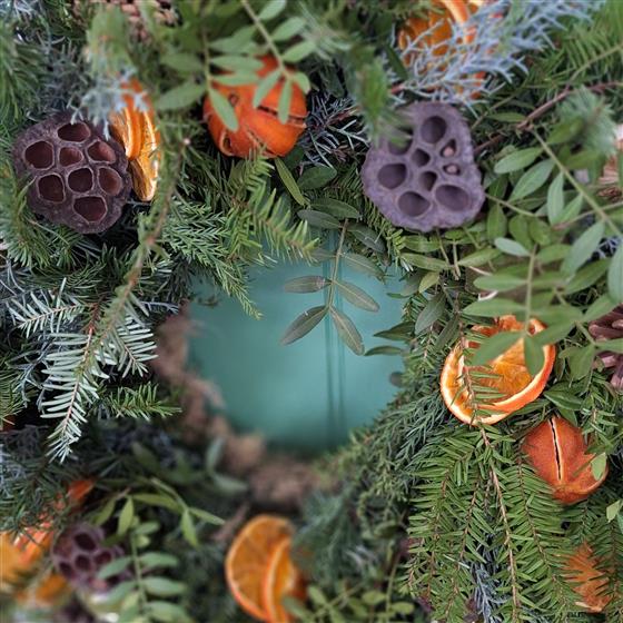This is a wreath that is all about the natural look with lots of foliage and natural decorations that will include pine cones, whole and sliced oranges and limes with lotus heads.