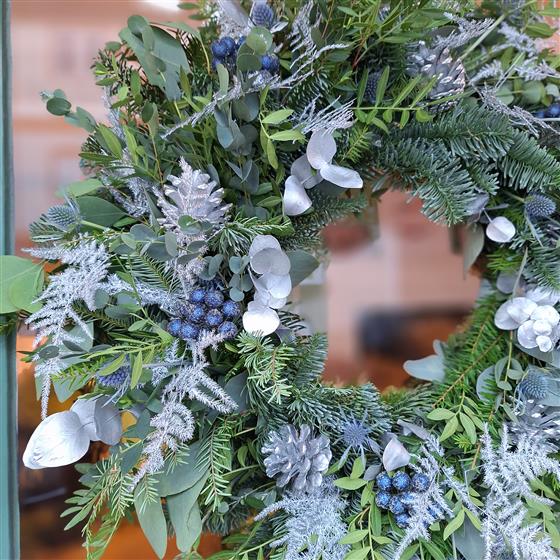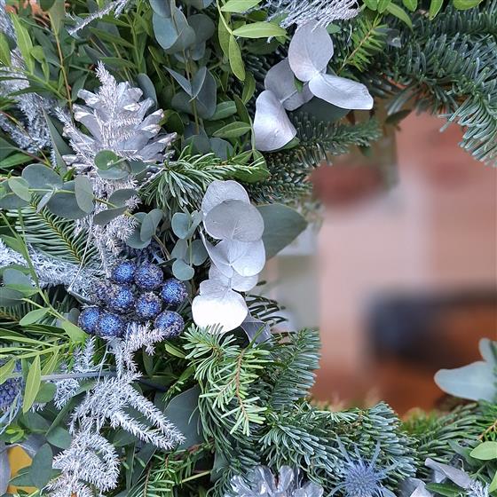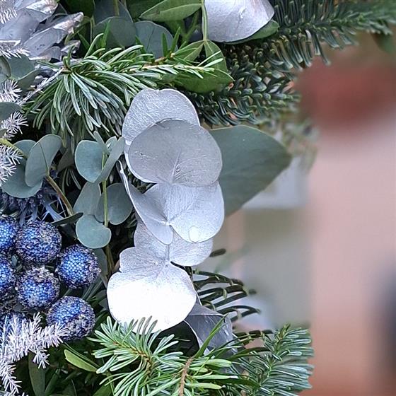 Seasonal foliage with accents of sliver and blue finished with a blue bow